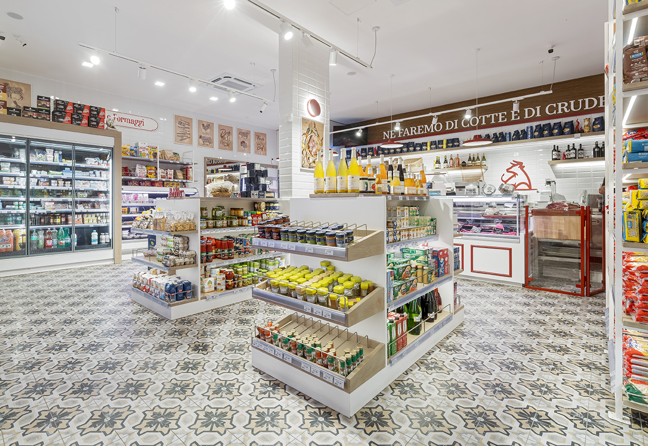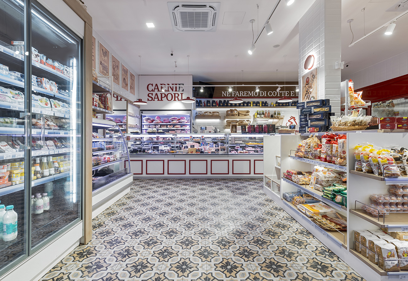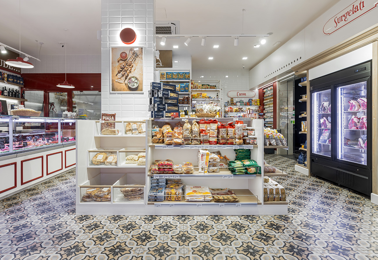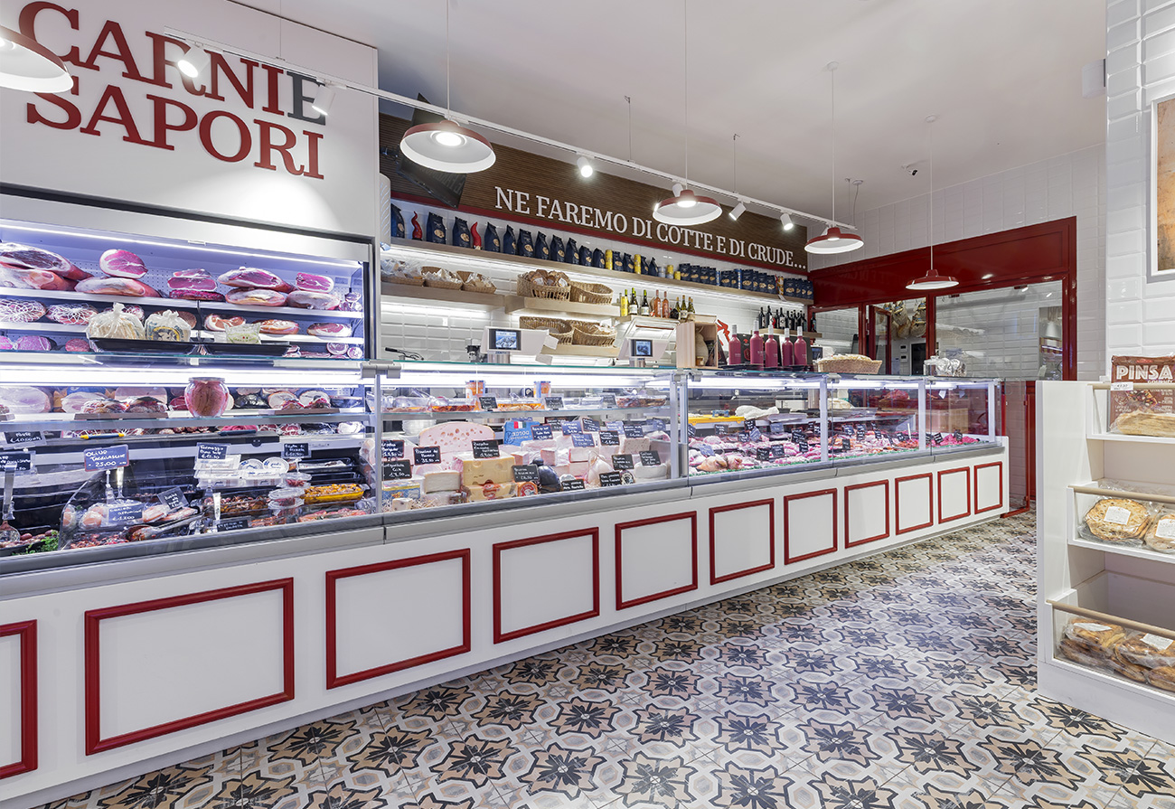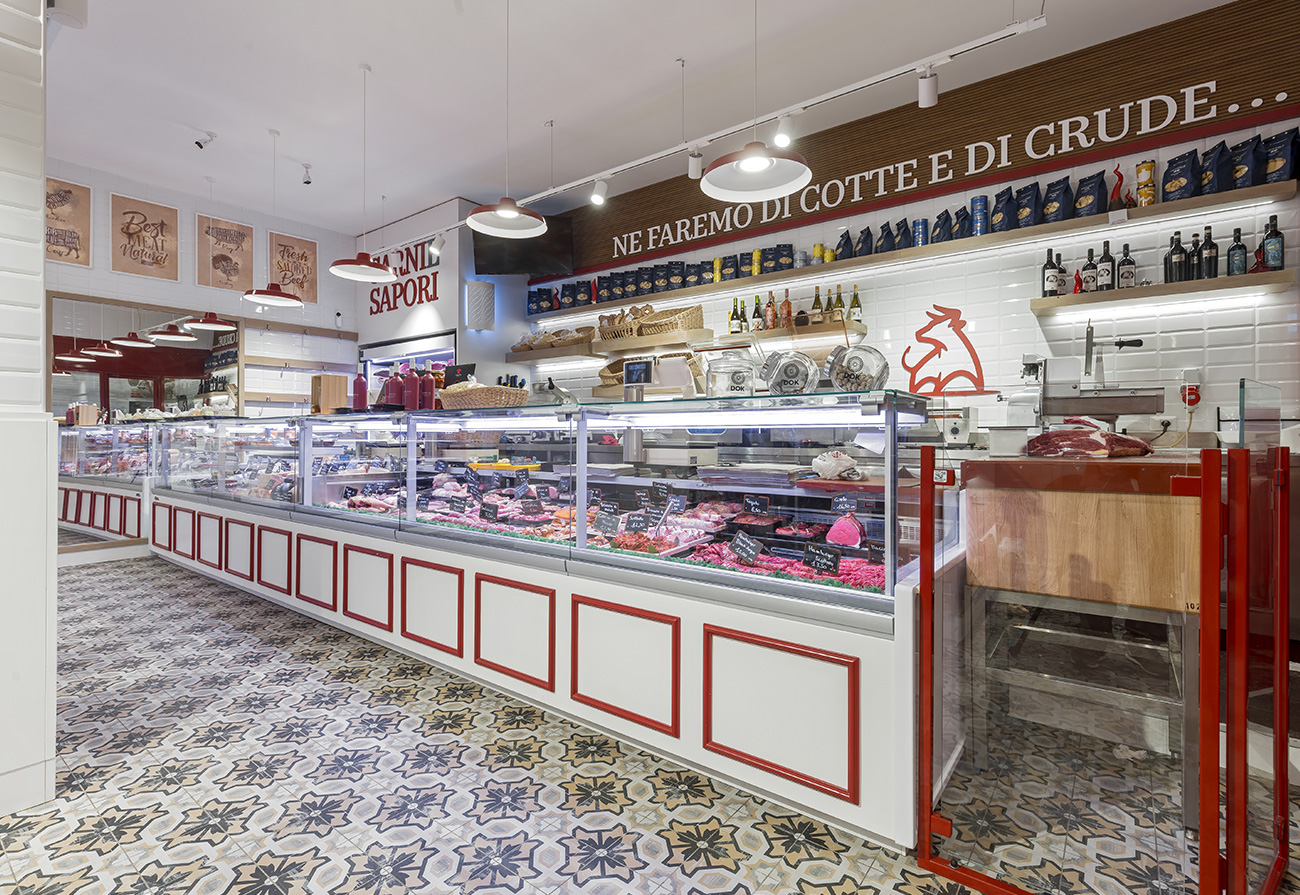 Il banco carni e salumi, punto focale del locale, è stato progettato per offrire massima visibilità ai tagli esposti, con un’illuminazione studiata per valorizzare colori e texture naturali. Gli arredi su misura, insieme a un’attenta organizzazione degli spazi, favoriscono un flusso ordinato e intuitivo, migliorando l’esperienza d’acquisto. Lo studio dei flussi prevedeva uno stretto dialogo tra locale vendita e laboratorio, infatti questi ultimi sono strettamente collegati e sono suddivisi da una vetrata che esalta il lavoro di preparazione per rendere il tutto completamente visibile al fruitore.