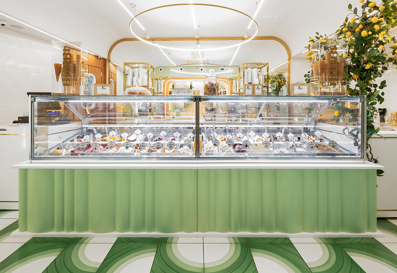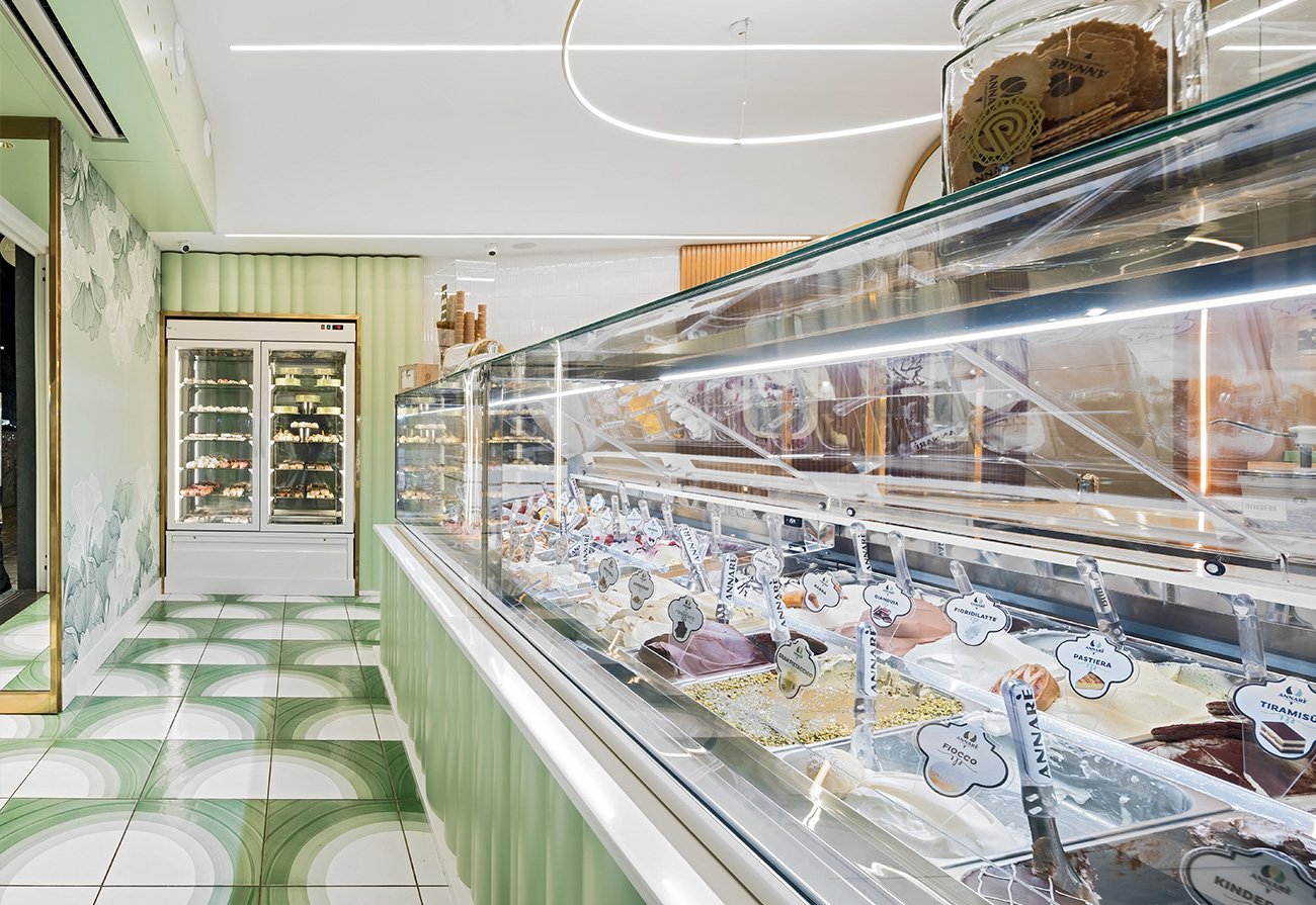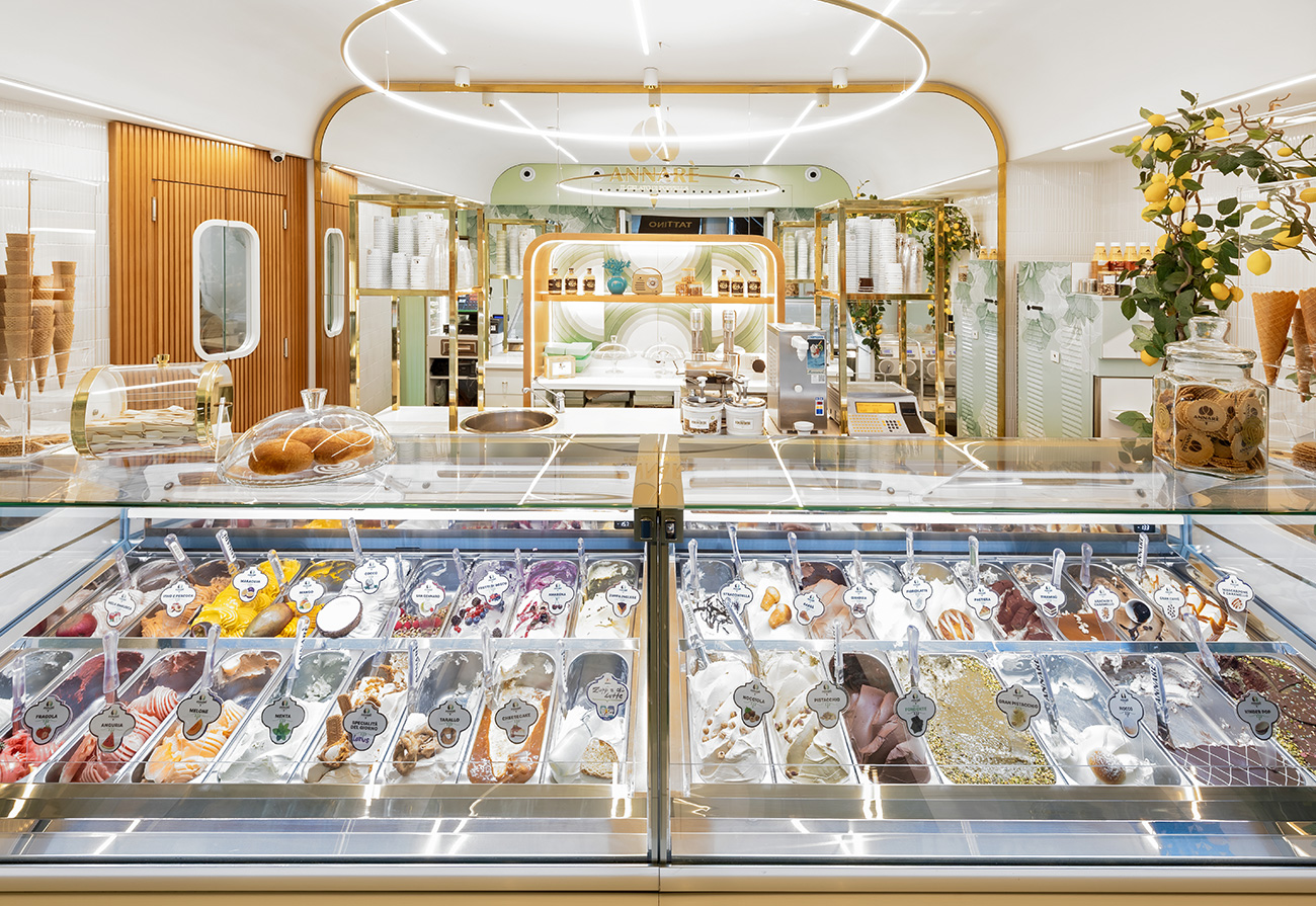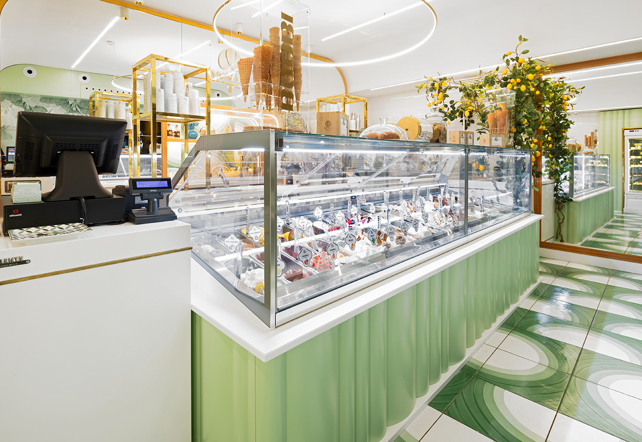 Linee morbide, colori luminosi e superfici materiche accolgono il visitatore in un’atmosfera fresca e genuina, proprio come i gusti proposti. Il banco gelati è il punto focale dello spazio: funzionale, scenografico, progettato per valorizzare ogni prodotto come un piccolo capolavoro da assaporare con gli occhi prima ancora che col palato.